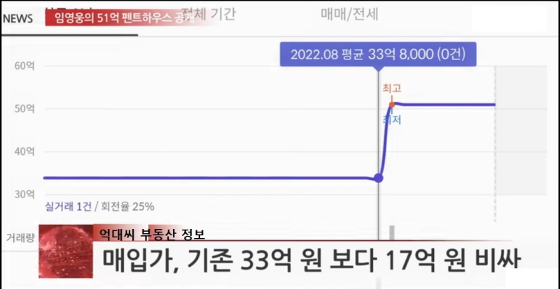 이런 이유로 임영웅이 이 펜트하우스를 구매하기 전에는 두 번의 거래 기록이 있었습니다. 직전 거래는 2019년 1월에 33억 8000만 원에 이루어졌고, 임영웅은 그보다 17억 2000만 원을 더 지불하여 51억 원에 매입했습니다.