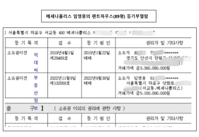 또한, 별도의 근저당권이 설정되어 있지 않은 점으로 미루어 보아 임영웅은 전액 현금으로 구매했을 가능성이 높습니다.